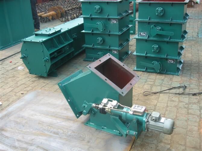 该阀主要由阀体、阀轴、阀板、曲柄机构、电动推杆(电液动推杆或手动机构)等组成。工作时电、液动推杆的直线往复运动,(手动由外力)通过曲柄带动阀轴、阀板作一定角度的摆动,从而达到控制物料流向,分送物料之目的。